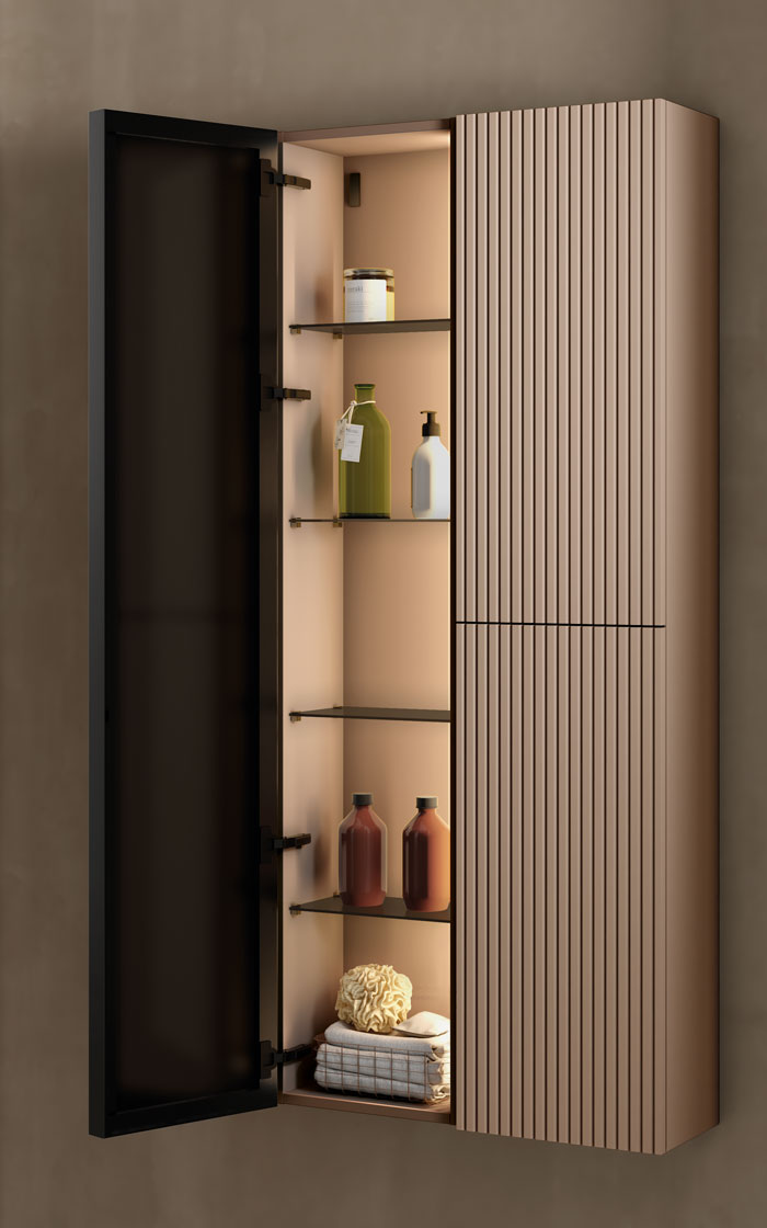 Bajo lavabos con frentes vitrina e iluminación interior (por defecto 4000ºK y opción 2700ºK) y acabado Laca Select Mate XC07.