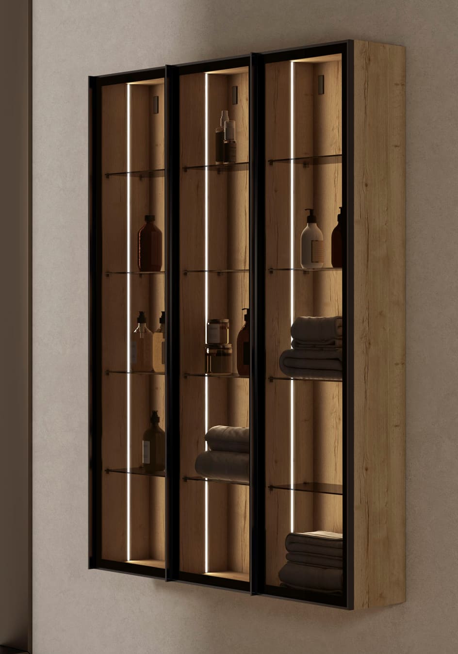 Columnas frente vitrina con baldas de cristal fumé templado e iluminación interior (por defecto 4000ºK/opción 2700ºK).