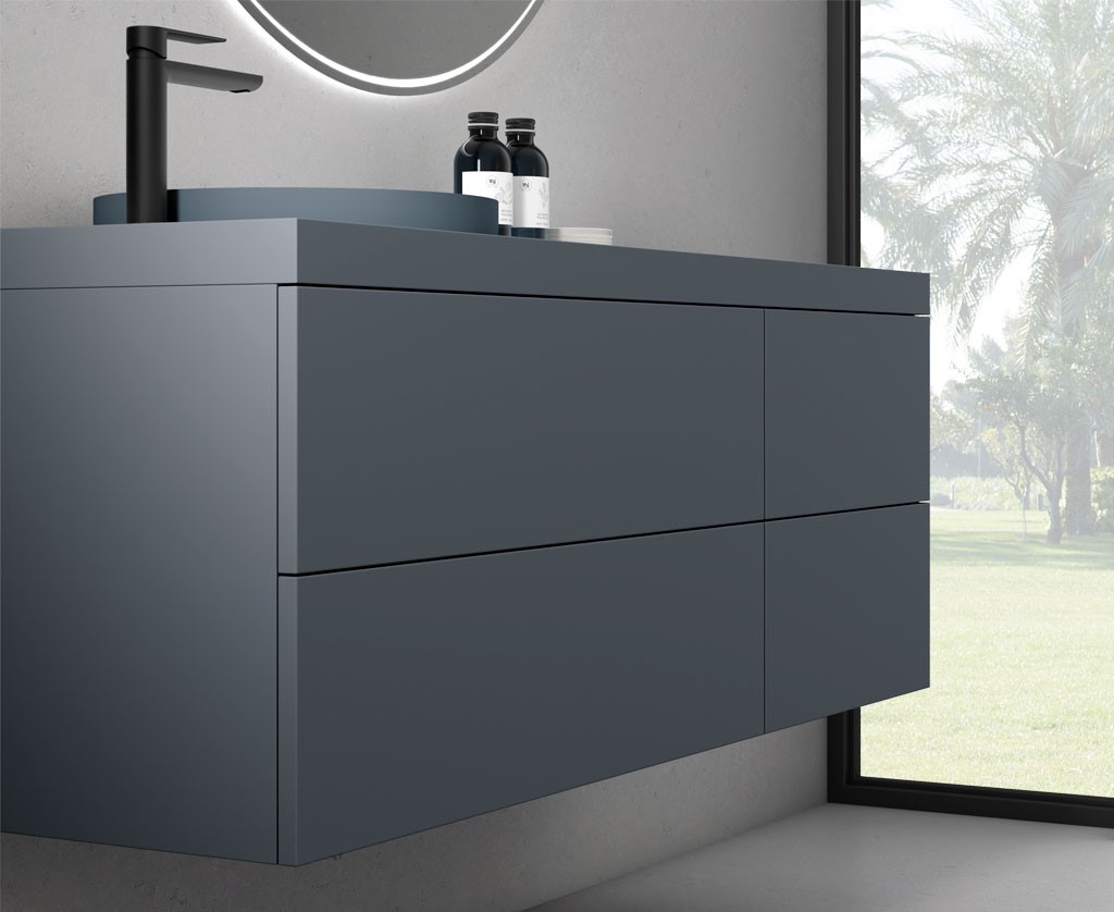 Mobiliario y encimera en acabado Fenix Bromo con apertura Push.