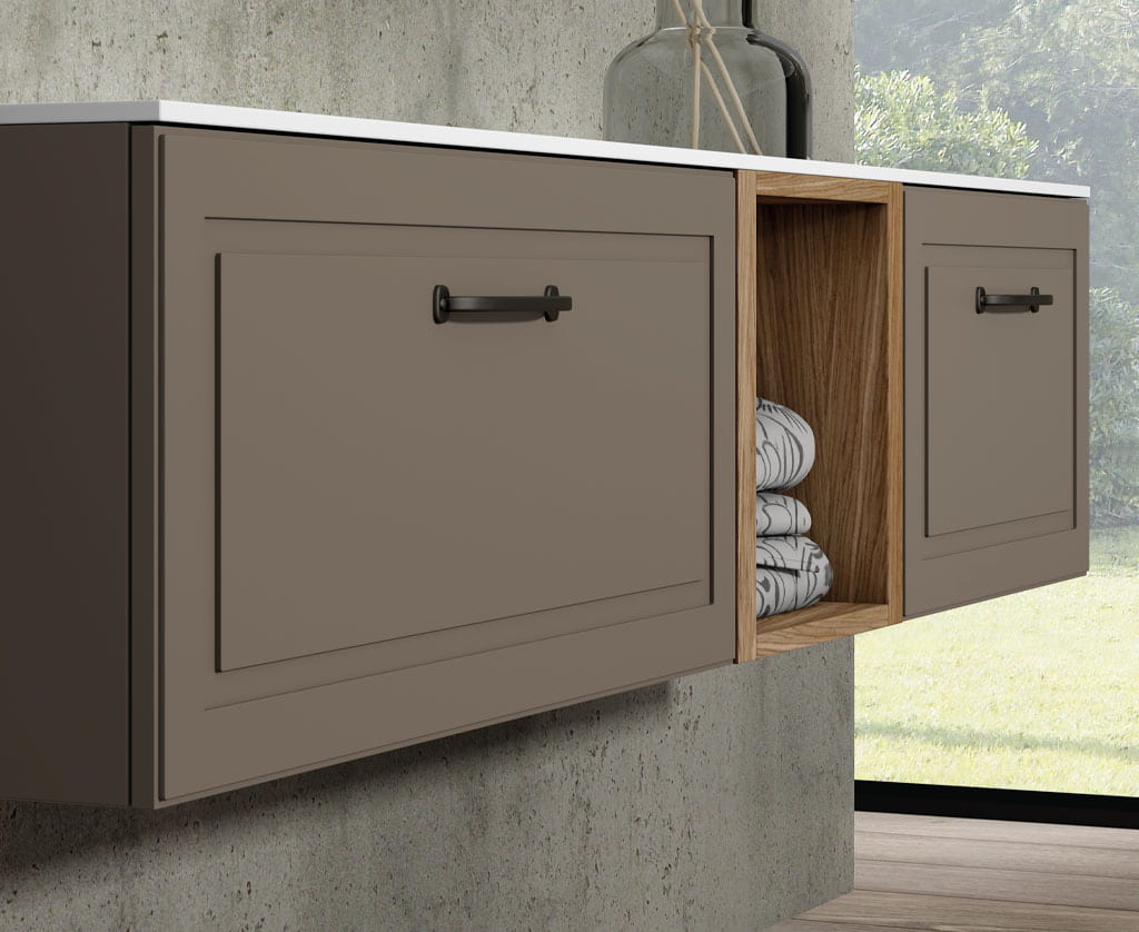 Mobiliario en acabado Laca Select Mate XC06 y madera Nogal Claro.