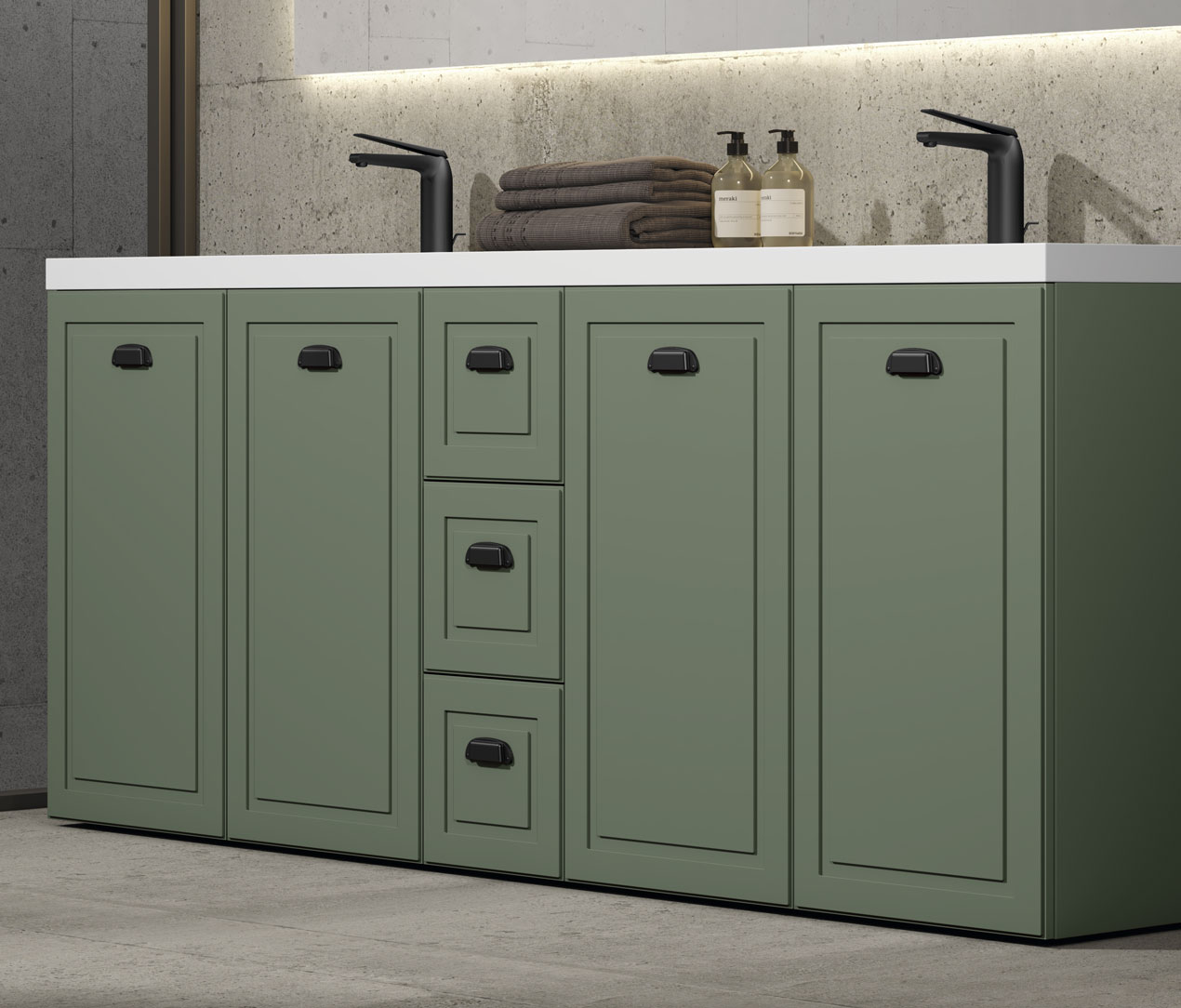 Mobiliario en acabado Laca Select Mate XV03 y tirador Paola negro.