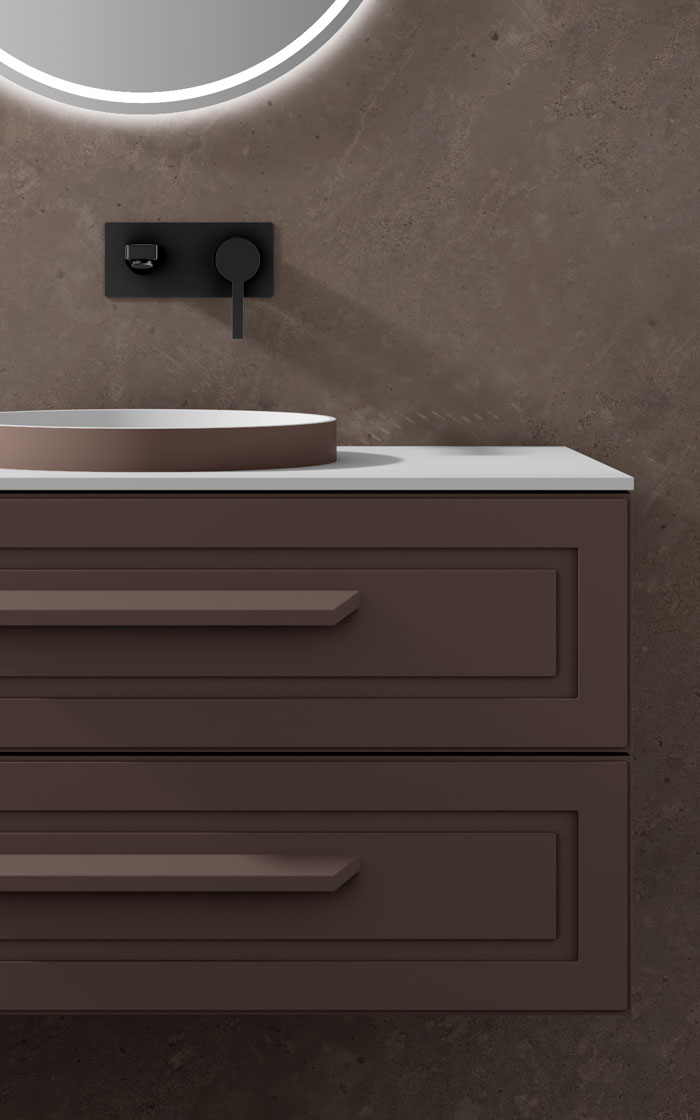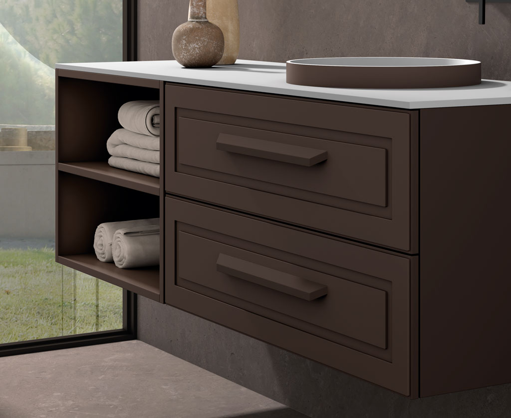 Tirador Cristina y lavabo New Pompei semi encastre mismo acabado que el mobiliario.