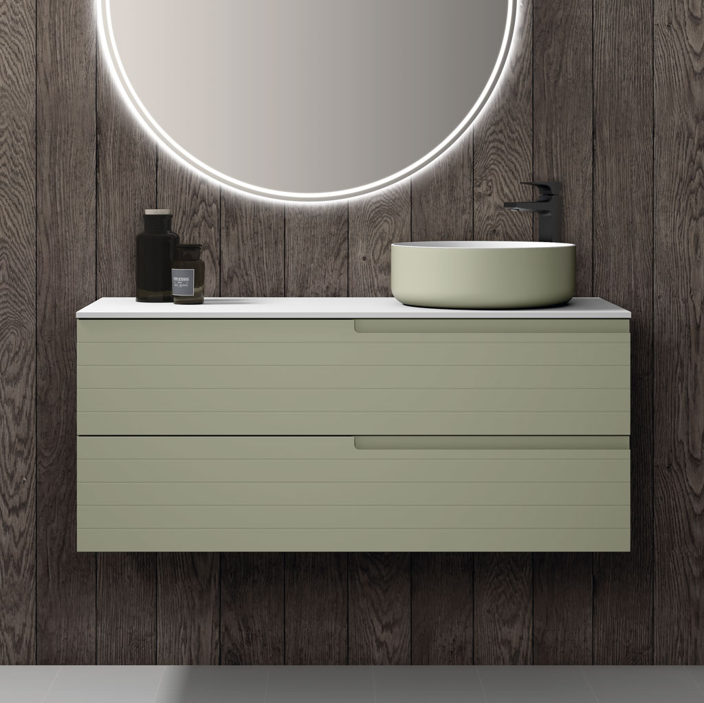 Mobiliario y lavabo de posar New Pompei en acabado Laca Select Mate XV05. Sistema de apertura en uñero Lara en posición P6.